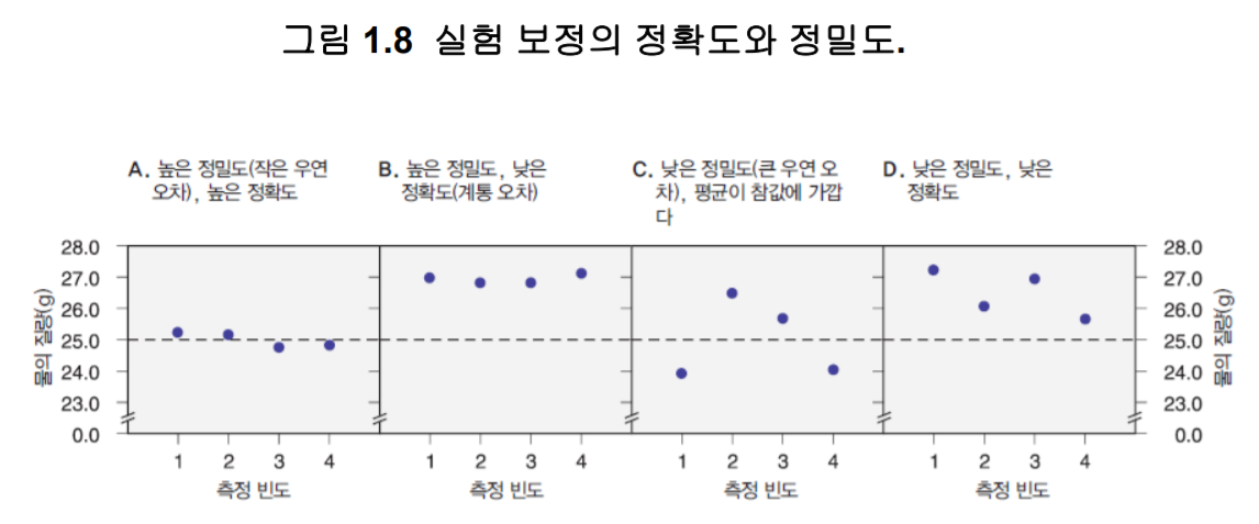 정확도 - 측정값이 실제값에 얼마나 가까운지를 말한다. 계통 오차실제값보다 항상 높거나 혹은 항상 낮은 값들을 만든다