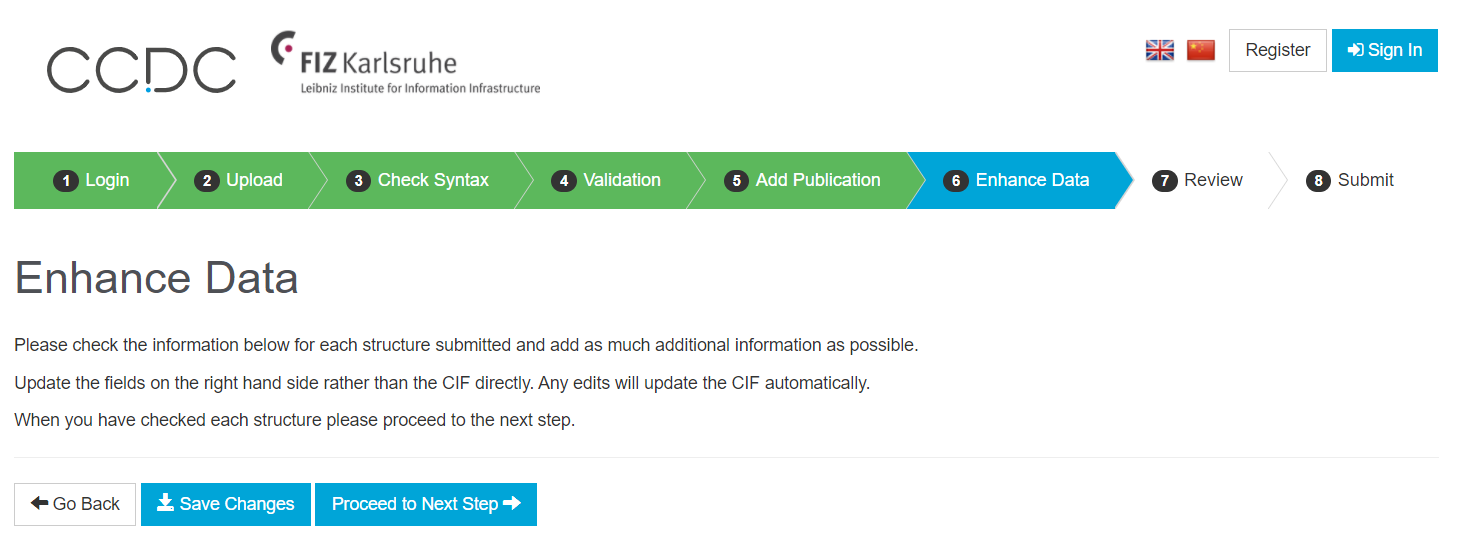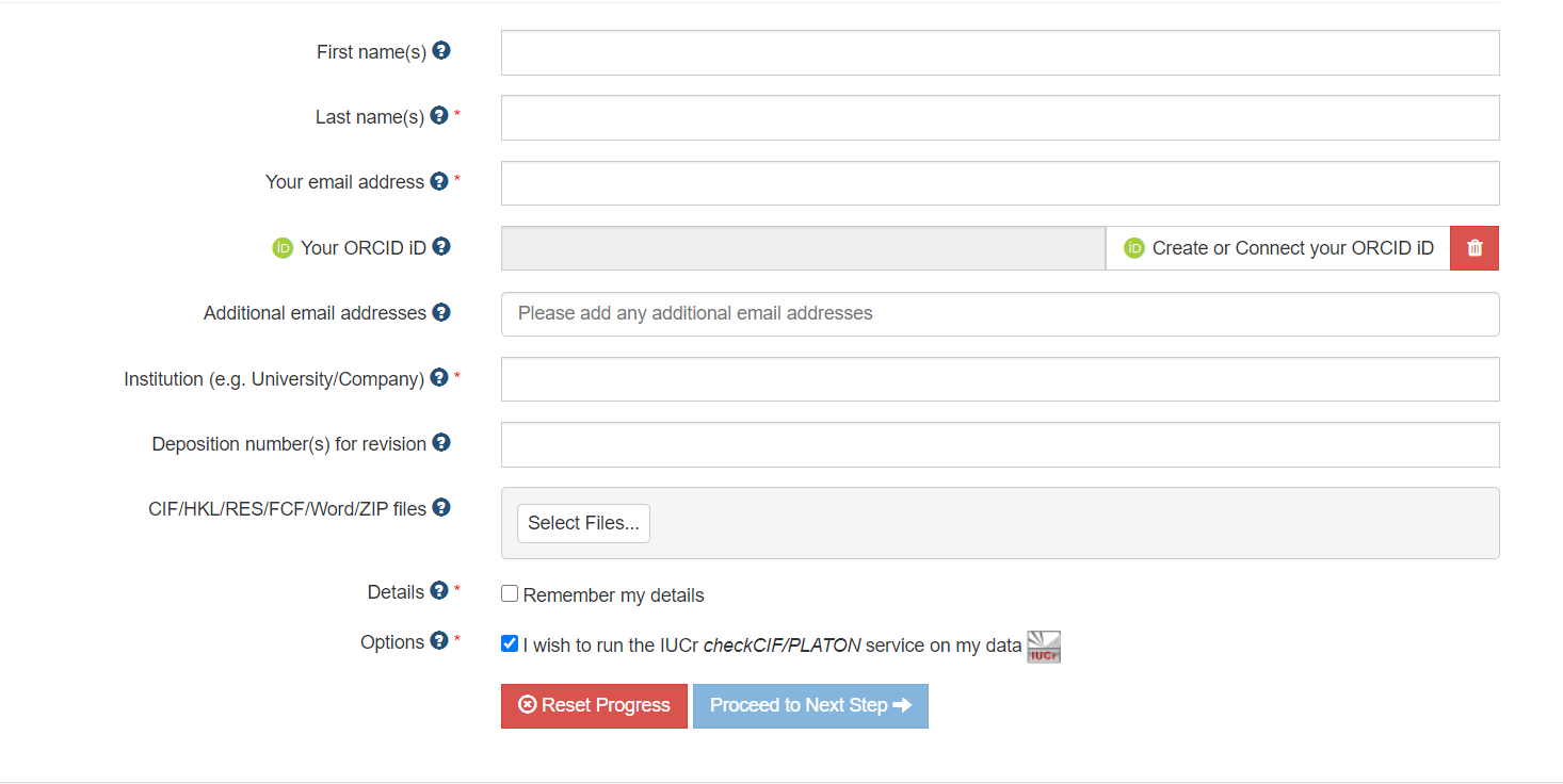 개인정보를 순서대로 입력하시고, 빨간색으로 * 돼있는 부분은 반드시 입력하셔야 합니다. 그리고 CIF/HKL/RES/FCF/Word/ZIP Files 항목에 본인이 가지고 있는 CIF 파일을 업로드하시면 됩니다. 업로드까지 완료가 되면 Proceed To Next Step 를 클릭하시고 다음 페이지로 넘어가시면 됩니다.