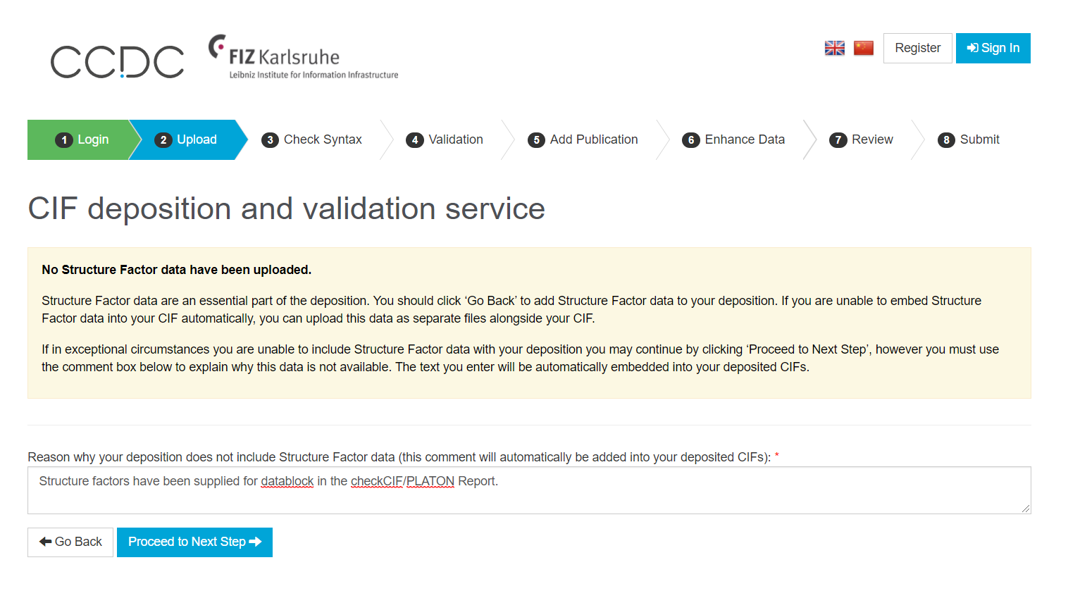 저도 처음으로 Upload 단계에서 당황을 하기는 했었는데요. 당황한 이유는 No Structure Factor data have benn uploaded 라는 문구를 봤기 때문입니다. 최근에는 CIF 나 다른 파일에 Structure Factor 를 함께 넣어서 올리고 있는 추세라고 글을 본 기억이 있습니다. 제가 결정을 푼게 몇년전이라서 Structure Factor 내용이 포함이 안된것인가했는데.. CheckCIF 파일을 보니 datablock에 그 내용이 포함된 것을 확인했습니다.