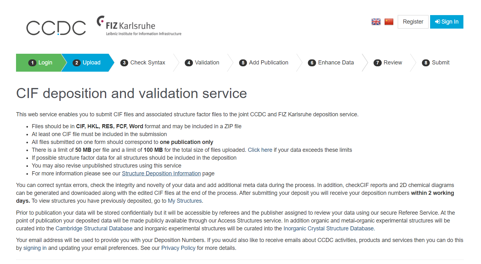 CCDC 에 CIF 를 등록하기 위해서는 다음의 사이트에 접속하셔야 합니다.