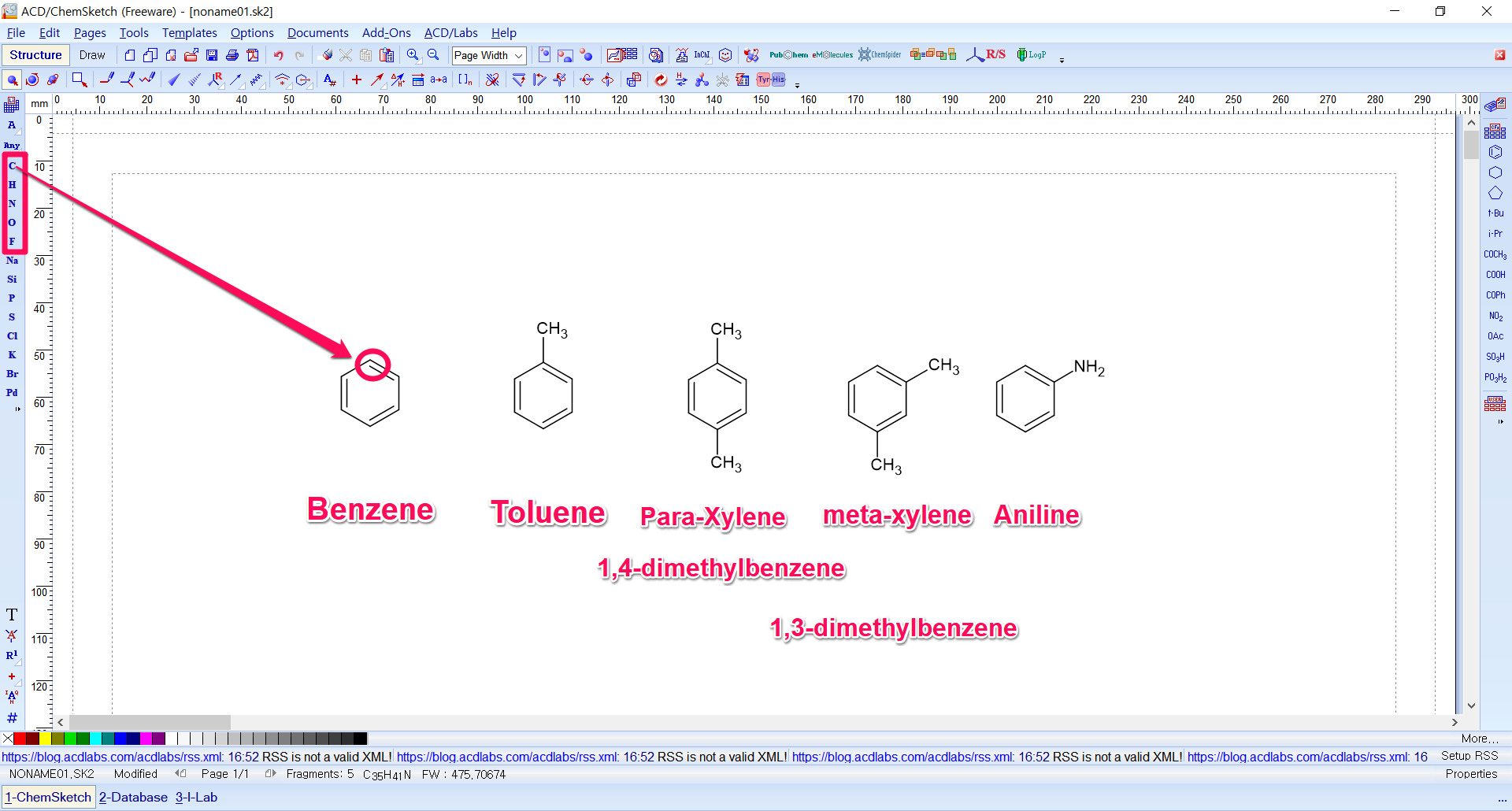 프로그램 설치하시고 ChemSketch를 실행하시면 아래와 같은 화면 구성을 보실 수 있습니다. 오늘은 ChemSketch 를 통해서 우리가 고등학교 화학I, II 등의 유기화학에서 배웠던 방향종 화합물을 시리즈로 그려보도록 하겠습니다.