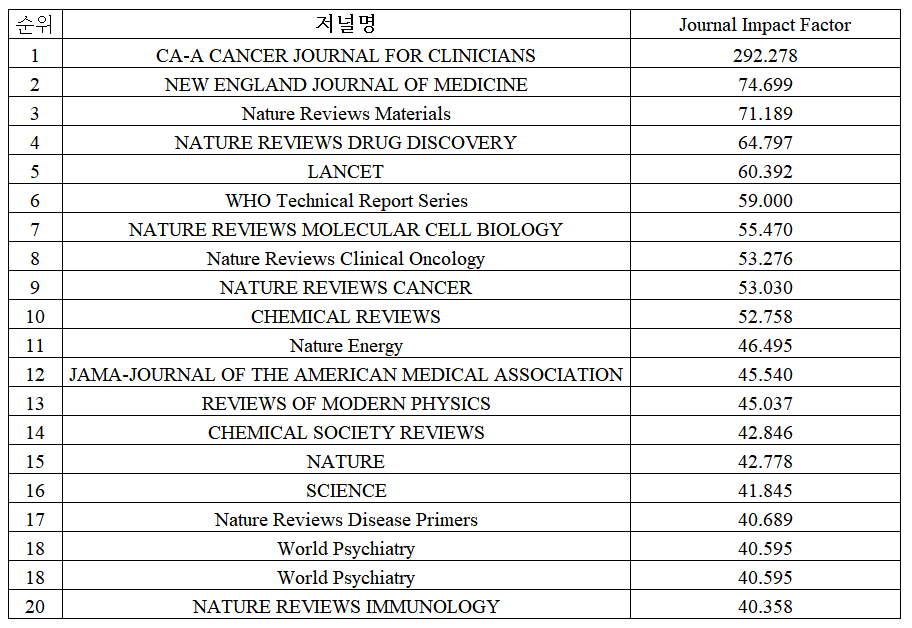 JCR 에서 발행하는 영향력 지수 (IF) 상위 20개 저널입니다. 1위는 CA-A Cancer Journal For Clinicians 로 292.278의 영향력 지수를 기록했고, 20위는 Nature Reviews Immunology 로 40.358입니다.