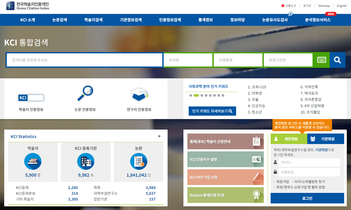 ▶ 한국학술지인용색인 홈페이지: https://www.kci.go.kr/kciportal/main.kci#