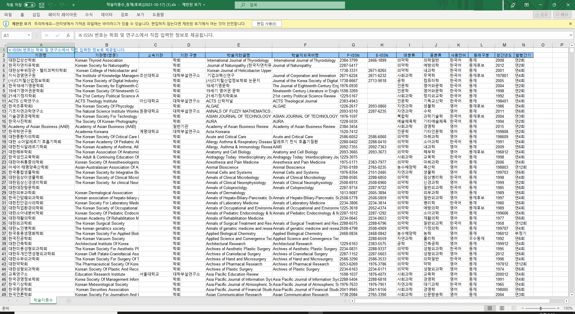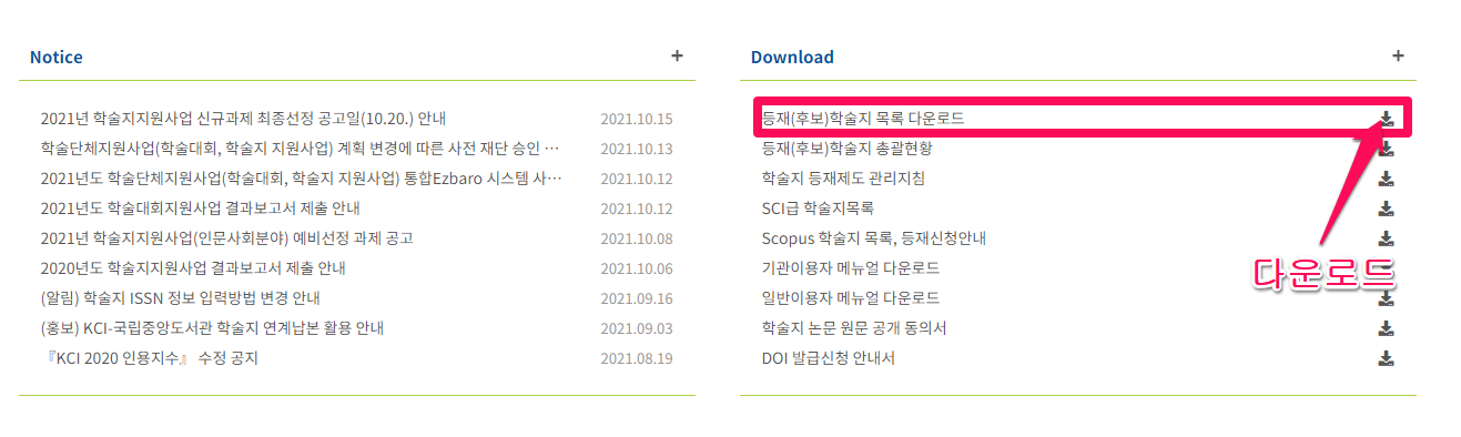위 화면에서 보이는 것처럼, Notice 메뉴 옆에 Download 메뉴가 있습니다. 첫번째 다운로드 파일중에, 등재(후보)학술지 목록 다운로드를 다운 받으시면 엑셀 파일로 받으실 수 있습니다.