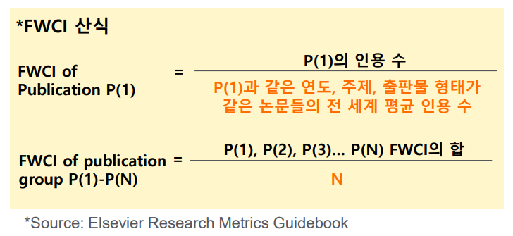 - FWCI의 전세계 평균값은 1이며, 지수가 1보다 높으면 상대적으로 더 많이 인용되었다는 의미이고 1보다 낮다면 평균보다 덜 인용되었다는 의미