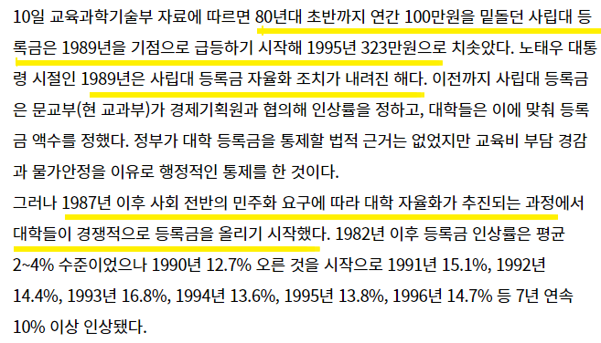 한국일보 기사에서 내용을 잘 정리해주고 있는 것 같긴합니다. 그 기사 내용과 수치를 비교해보니 확실히 1995년 기점으로 대학수 기울기가 커지고 숫자고 확늘어나고 있습니다.