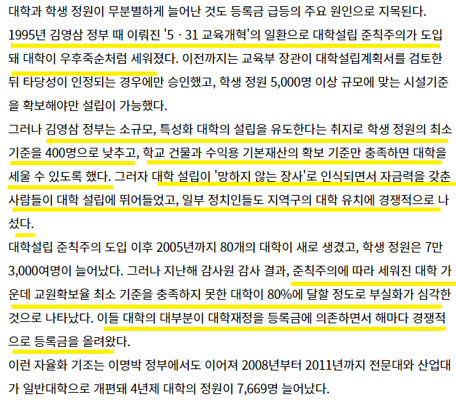 위 기사를 더 찾아보니 1995년 김영상 정부때 5.31 교육개혁의 일환으로 대학설립 준칙주의가 도입되면서 대학 수가 많이 늘었다고 평가를 하고 있네요. 위 그래프를 보더라도 1990년도 초반 부터 대학수의 기울기가 커지기 시작하면서 1995년 그해즈음 부터 2000년대 초반까지도 급격하게 증가하는 추세를 보이고 있습니다.