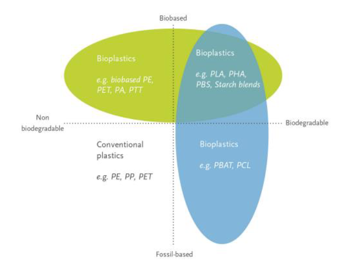 여기서 색상이 있는 부분이 바이오플라스틱 영역이며, 1사분면은 바이오 기반 플라스틱이면서 생분해성인 경우의 바이오플라스틱이다. 또한 2사분면은 바이오 기반 플라스틱이면서 생분해성이 아닌 경우인데, 예를 들면 바이오 기반 PET(polyethylene glycol terephthalate)가 있을 수 있다.