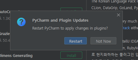 설치후에는 Restart IDE를 누르시면 언어 환경 설정이 한국어로 바뀝니다.