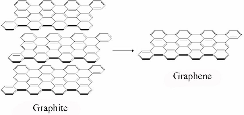 그래핀은 그림1에서 볼 수 있는 것처럼, 그래파이트 (흑연) 을 구성하는 하나의 레이어 (Single Layer)를 칭합니다. 그래핀은 탄소(Carbon)로 이루어진 구조이며 Carbon-Carbon 은 공유결합으로 연결돼있고, 위 그림처럼 Hexagon 형태를 갖고 있습니다.