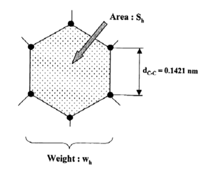 비표면적의 계산은 단위 Hexagon 의 표면적과 무게를 이용해서 계산할 수 있습니다. 다음 그림에서 볼 수 있는 것처럼, 단위 Hexagon의 Area: Sh 를 계산하고, 그에 따른 무게: Wh 를 계산하여 비표면적의 단위에 따라 계산을 해보면 앞서 설명한 그래핀의 이론적 비표면적을 계산할 수 있습니다.